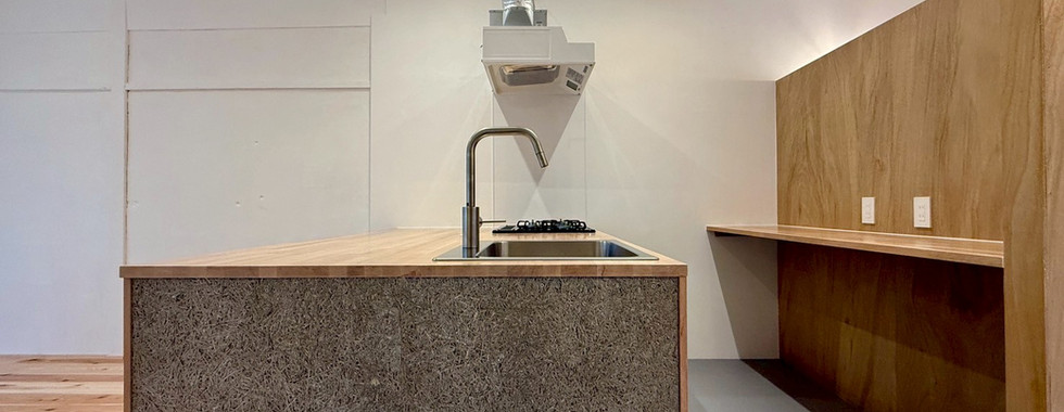 部屋の中心に配置されたのは木の質感を活かしたカウンターキッチン。料理のしやすさはもちろん、来客時にはダイニングや交流の場としても機能します。